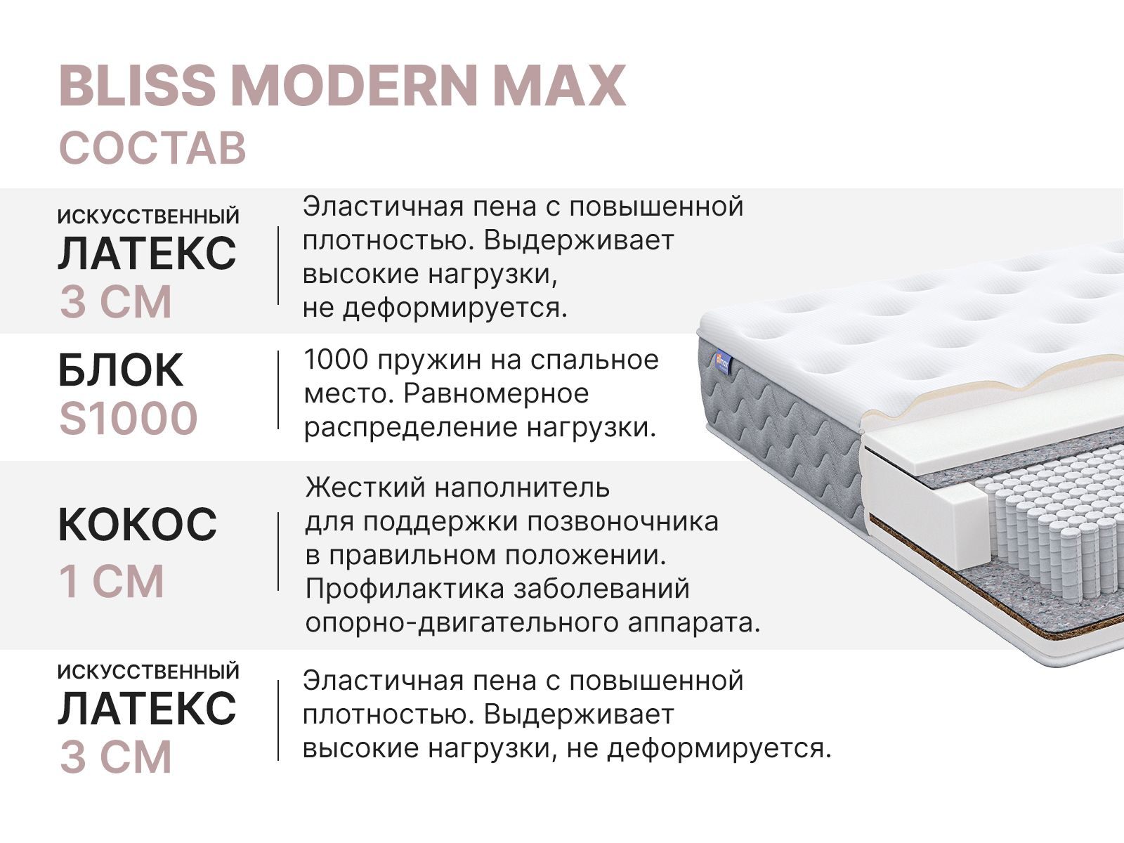 Димакс Bliss Modern Max — классический ортопедический матрас высокого комфорта с двумя уровнями жёсткости, который подходит для любого типа телосложения и любимой позы сна. Благодаря комбинации искусственного латекса и натуральной кокосовой койры, модель обеспечивает идеальный баланс мягкости и поддержки, словно вы отдыхаете в дорогом отеле.