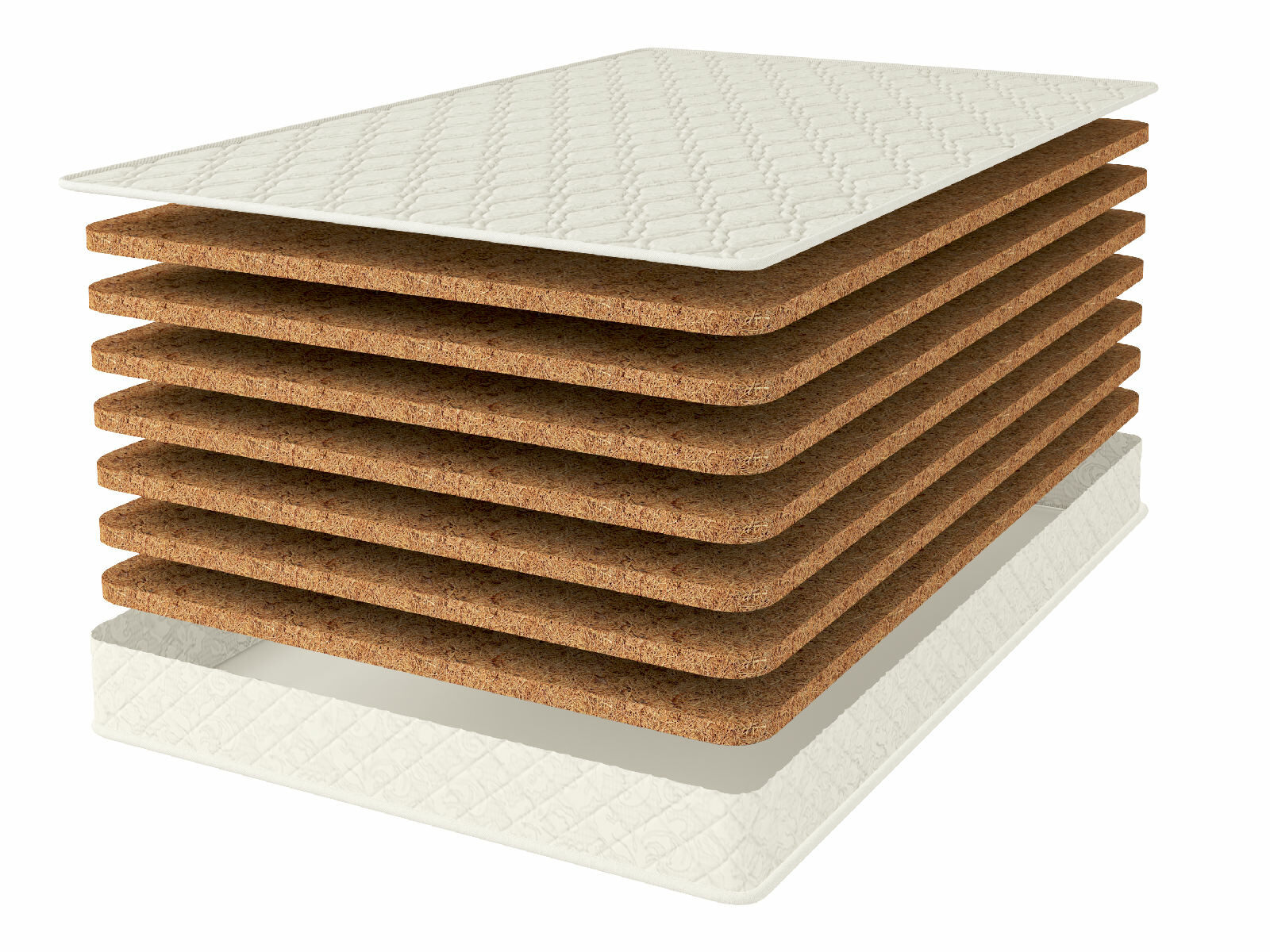 Высота модели составляется 21 см и складывается из 7 плит кокосовой койры, составляющих единый блок. Так образуется единая натуральная основа, которая формирует матрас.