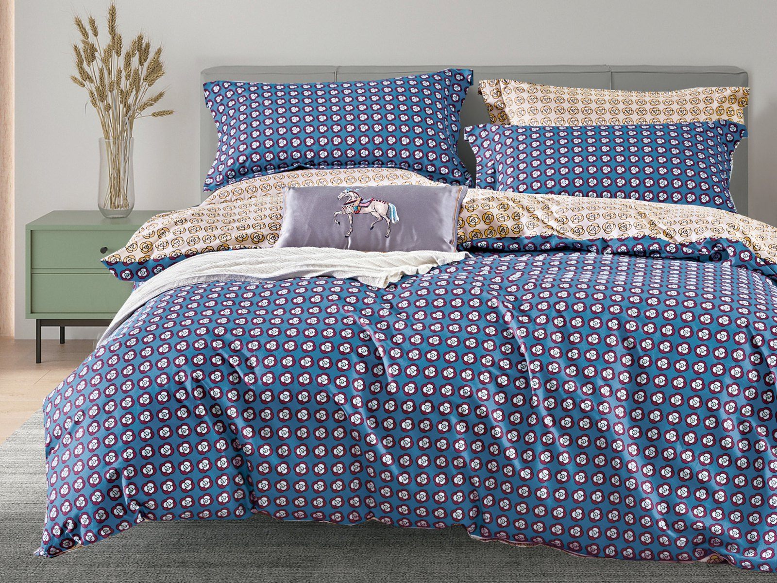 Все наволочки имеют удобный клапан и декоративную отделку "ушки". Пододеяльник двухсторонний, поэтому Вы сможете менять вид постели в зависимости от настроения. Для удобства пододеяльник застегивается на молнию, что значительно упрощает процесс его замены.