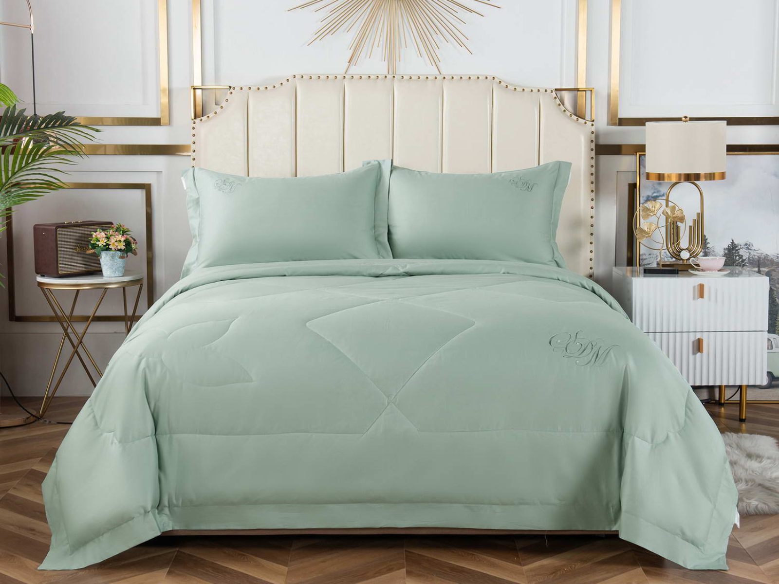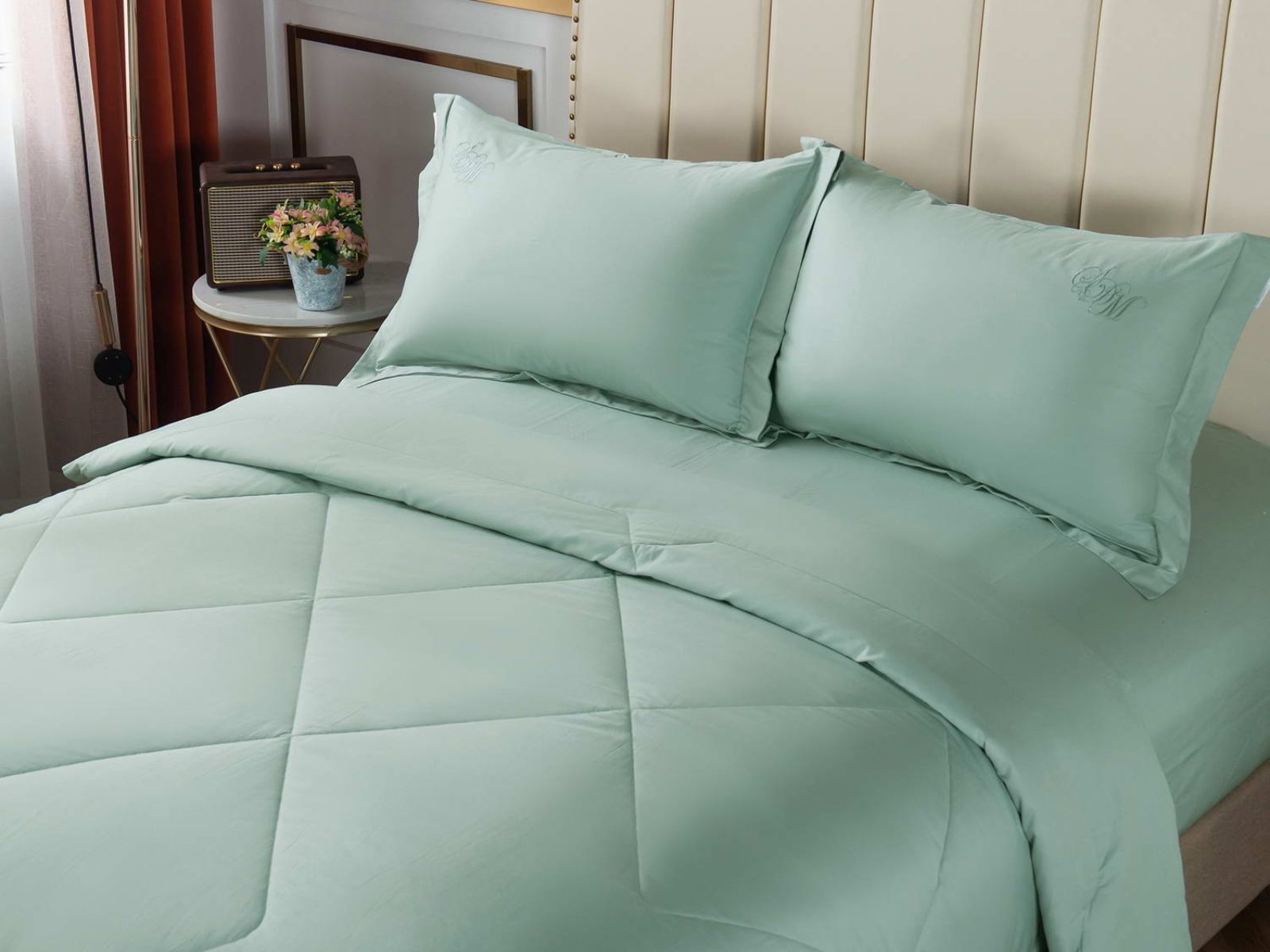 В комплект входят простыня, наволочки и одеяло. Одеяло простеганное, легкое и воздушное, его можно стирать в стиральной машине. Благодаря микроволокну в составе наполнителя для одеяла, оно всегда принимает свою начальную форму.