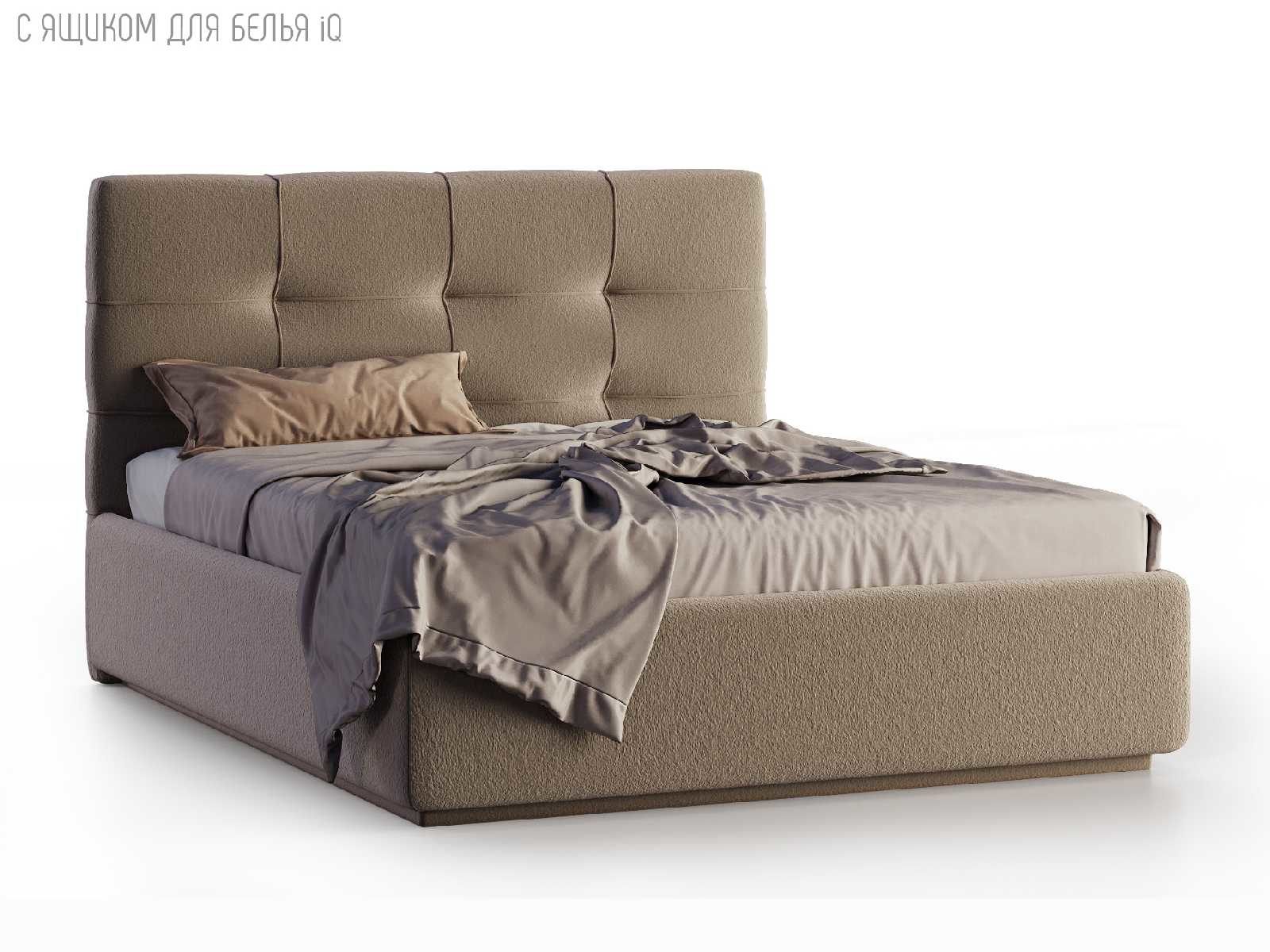 Кровать укомплектована IQ с подъемным механизмом и ящиком для белья без дна (дополнительная платная опция - дно к ящику IQ из HDF (ХДФ). Каркас кровати на цоколе, декоративный чехол на цоколе съёмный. Глубина ящика для белья - 30 см, без ограничения нагрузки на ящик.