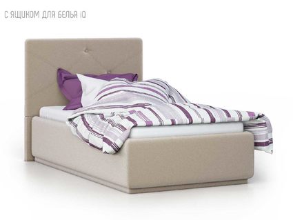 Кровать укомплектована IQ с подъемным механизмом и ящиком для белья без дна (дополнительная платная опция - дно к ящику IQ из HDF (ХДФ). Каркас кровати на цоколе, декоративный чехол на цоколе съёмный. Глубина ящика для белья - 30 см, без ограничения нагрузки на ящик.