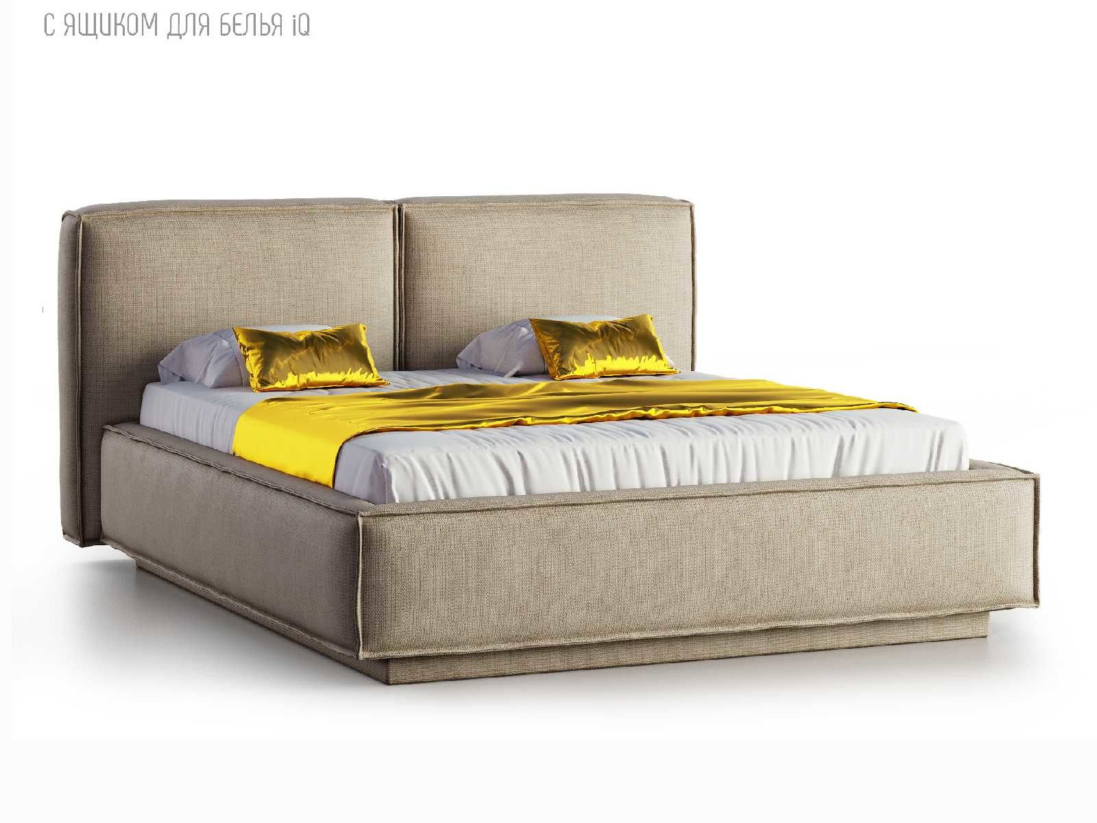 Кровать укомплектована IQ с подъемным механизмом и ящиком для белья без дна (дополнительная платная опция - дно к ящику IQ из HDF (ХДФ). Каркас кровати на цоколе, декоративный чехол на цоколе съёмный. Глубина ящика для белья - 30 см, без ограничения нагрузки на ящик.