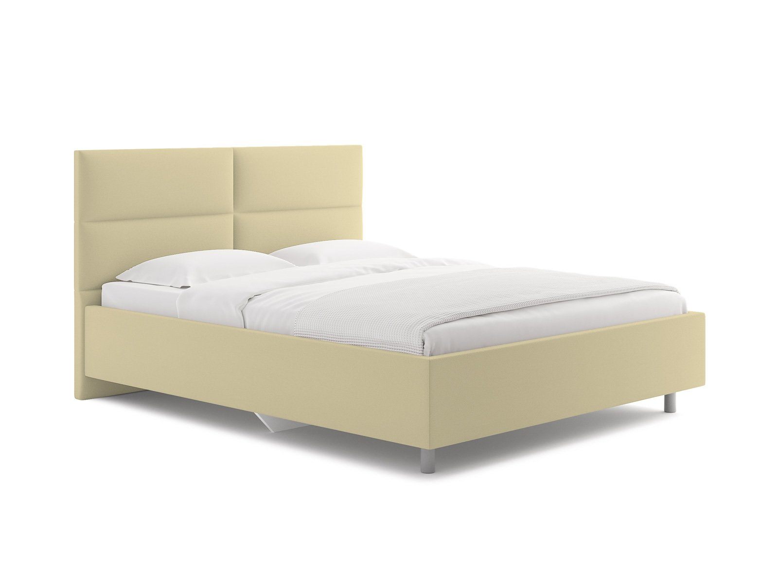 Лаконичная модель с изголовьем из объемных прямоугольников, сшитых между собой. Царги кровати выполняются по технологии съемного чехла. Модель изготовлена из ДСП. Обратная сторона изголовья обита спандбондом, но, при желании, её можно выполнить из основного обивочного материала.
