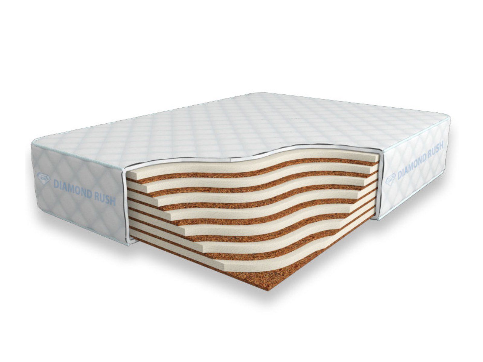Матрас Diamond Rush Mix Cocos 28 SD является беспружинным, т.е. не имеет в своей основе пружинного блока. В его состав входят одно или несколько чередований слоев латексированной кокосовой койры (1см) и искусственного латекса (3см). Такая модель матраса обладает средним ортопедическим эффектом и имеет разные по жесткости стороны.