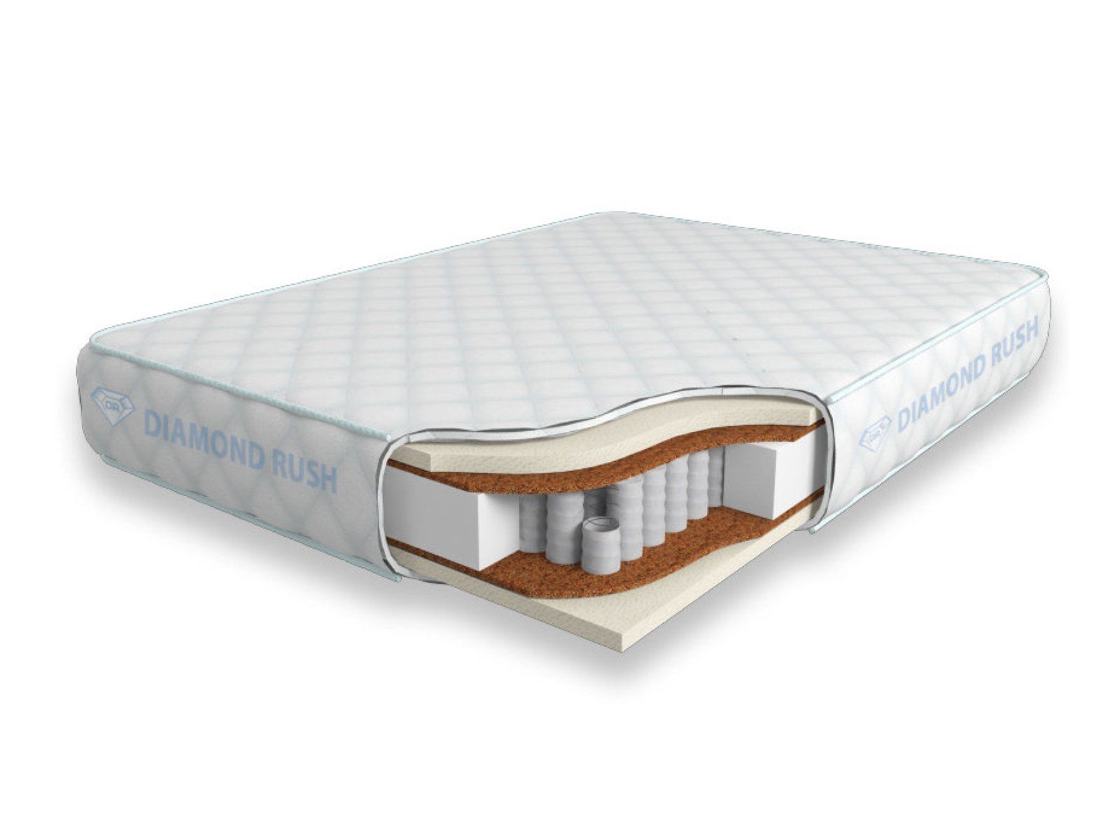 Матрас Diamond Rush Mono Mix Ergo 1440SD имеет в своей основе независимый пружинный блок 1440, состоящий из пружин диаметром 3-4 см. В качестве настилочных слоев поверх пружинного блока используются износостойкий искусственный латекс, а также латексированная кокосовая койра. Такой матрас имеет среднюю жесткость с обеих сторон.