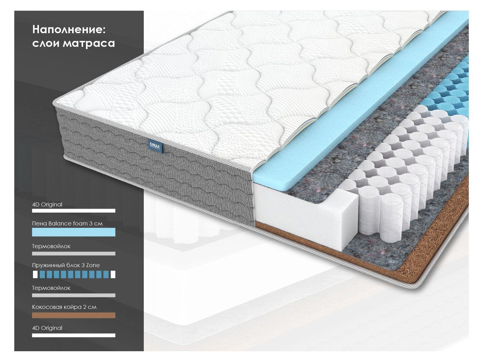 Димакс ОК Базис Хард – это ортопедический матрас на независимом блоке 3 Zone, Одна его поверхность с добавлением кокоса чуть выше средней жёсткости, а другая на основе пены Balance Foam – чуть мягче. Модель выдерживает нагрузку до 130 кг на спальное место и отлично подойдёт тем, кто ищет надёжную поддержку спины без избыточной жёсткости.