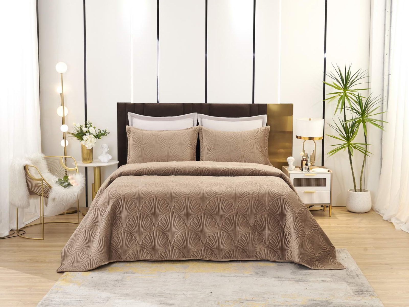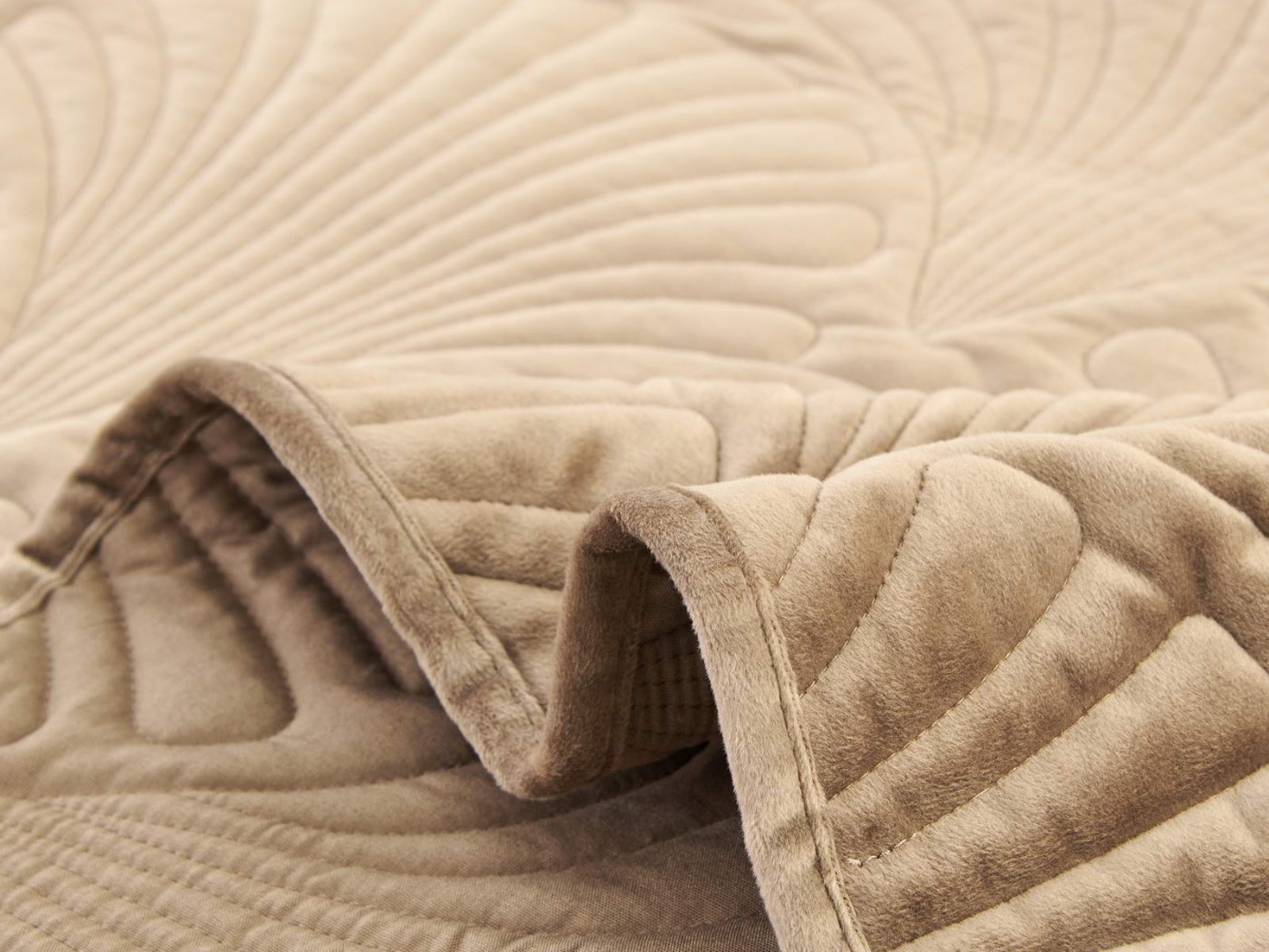 Роскошное велюровое покрывало Ариэль станет изюминкой любого интерьера, ведь оно потрясающе выглядит и приятное на ощупь. Обратите внимание на стежку покрывала – она выполнена в виде ракушек с эффектом 3D. Из-за особого плетения, велюровая ткань покрывала отражает свет и красиво переливается при различном освещении.