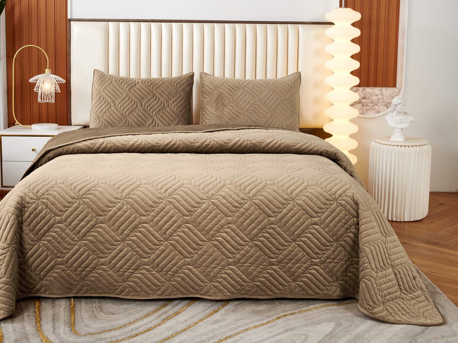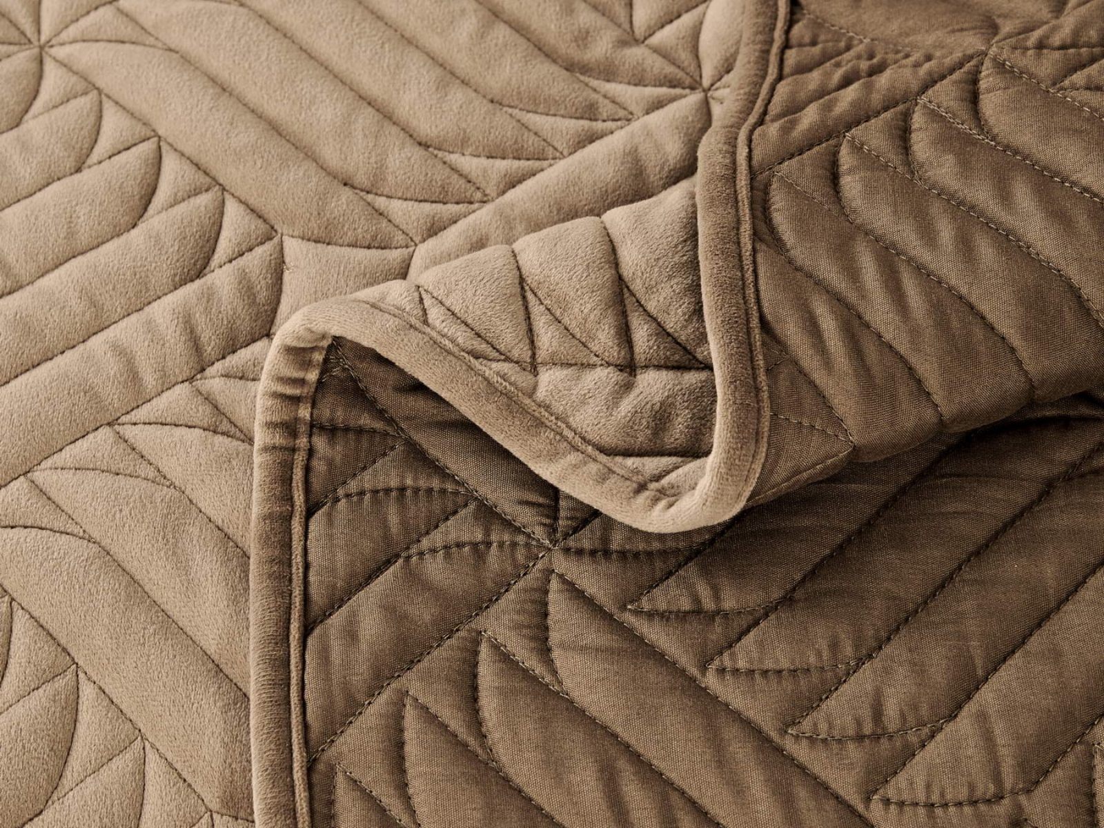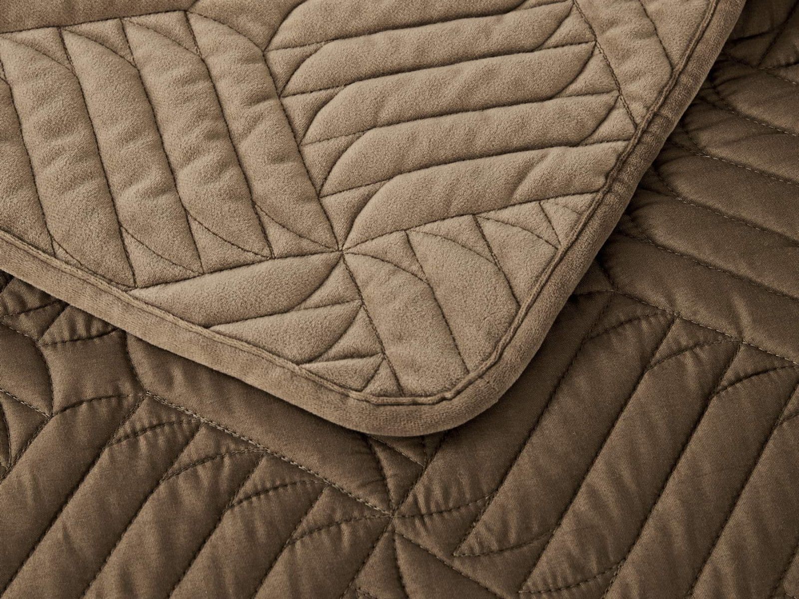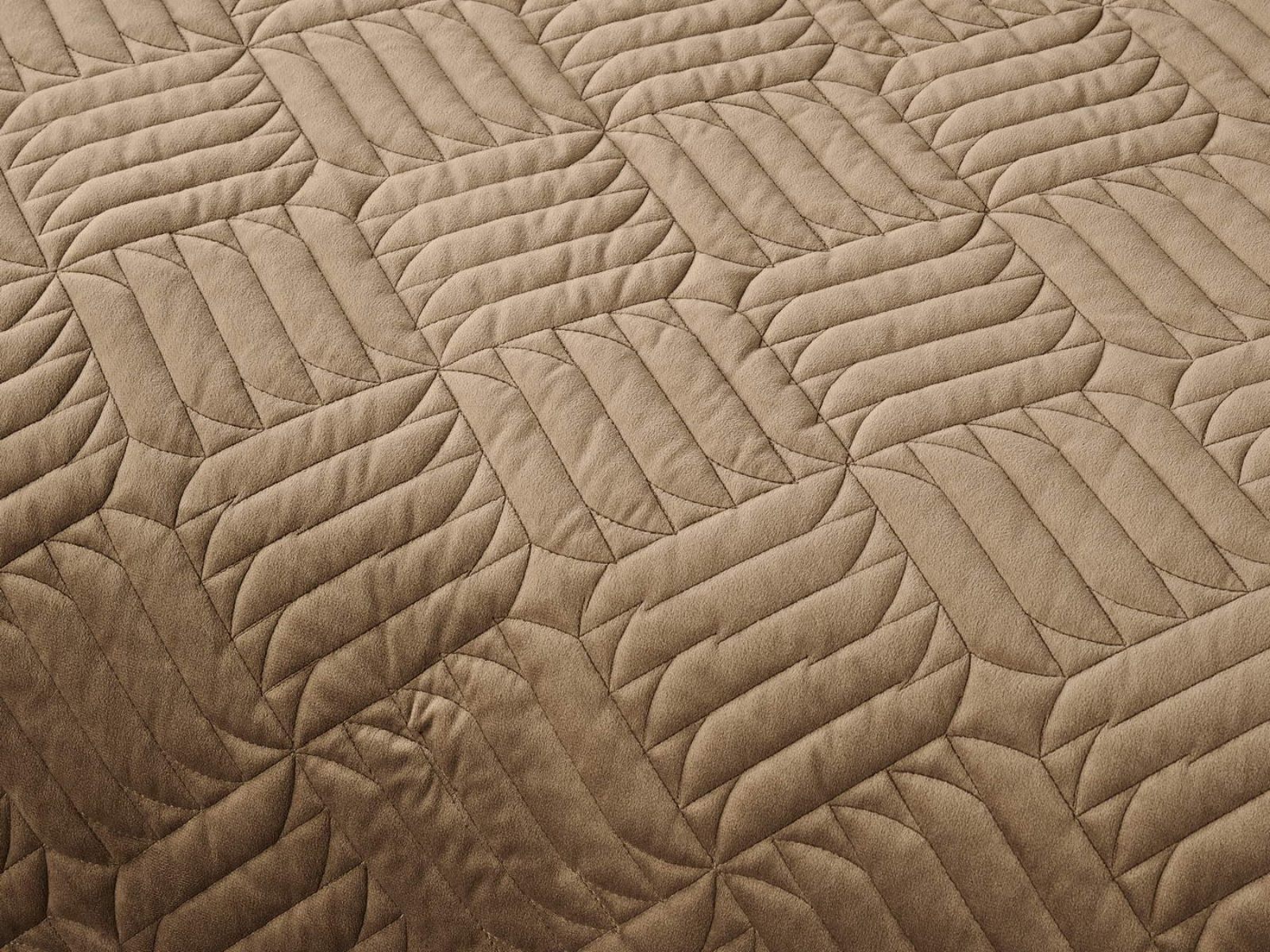 Покрывала выполнены в 10 оттенках: крем, мокко, пепельный, песочный, светло-бежевый, светло-серый, серый, темно-серый, чайная роза и черный. Стежка в виде геометрического орнамента подойдет к любому современному интерьеру. Из-за особого плетения, велюровая ткань покрывала отражает свет и красиво переливается при различном освещении.