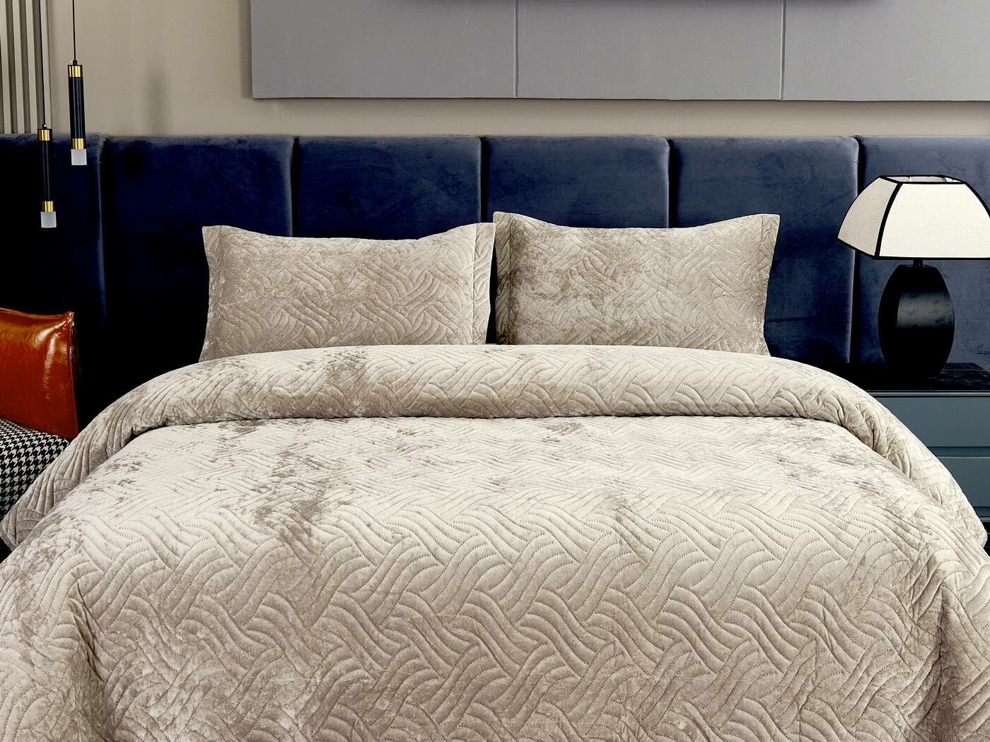 Покрывала «Деварта»: нежность и уют в вашем доме Окунитесь в мир комфорта и изысканности с новой коллекцией мягких бархатных покрывал «Деварта». Эти изделия станут настоящим украшением вашей спальни, добавив ей уюта и элегантности. Покрывала изготовлены из высококачественного бархата, который приятен на ощупь и обладает нежной бархатистой текстурой. Они устойчивы к износу и надолго сохраняют свой привлекательный внешний вид, яркость цвета и мягкость. Благодаря прочной и качественной декоративной стёжке «косичка» наполнитель надёжно зафиксирован внутри изделия. «Деварта» представлена в пяти оттенках: от тёплого бежевого до спокойного серо-голубого. Вы сможете подобрать идеальный вариант для вашего интерьера. Размерный ряд включает два варианта, что позволяет выбрать покрывало, которое идеально подойдёт для вашей кровати или дивана. В комплект входят две наволочки размером 50х70 см. Каждое покрывало аккуратно обшито кантом, а наволочки украшены милыми ушками шириной 5 см. Это придаёт изделиям особый шарм и делает их ещё более привлекательными. Не упустите возможность приобрести эти замечательные покрывала и создать в своём доме атмосферу тепла и уюта. «Деварта» подарит вам не только эстетическое наслаждение, но и незабываемые ощущения при каждом прикосновении.